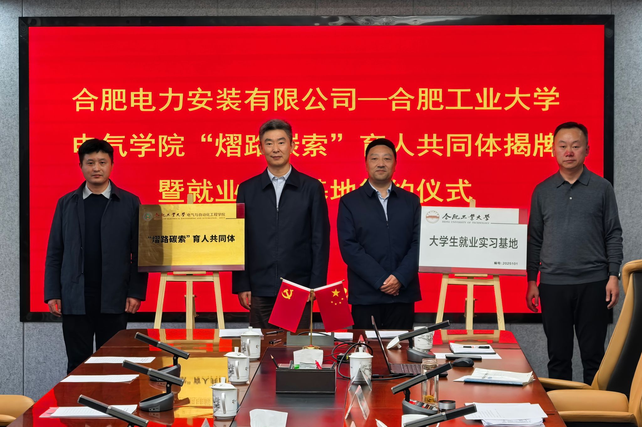 11月26日下午,电气与自动化工程学院师生赴合肥电力安装有限公司参观交流,并举行“熠路碳索”育人共同体和大学生就业实习基地签约揭牌仪式。