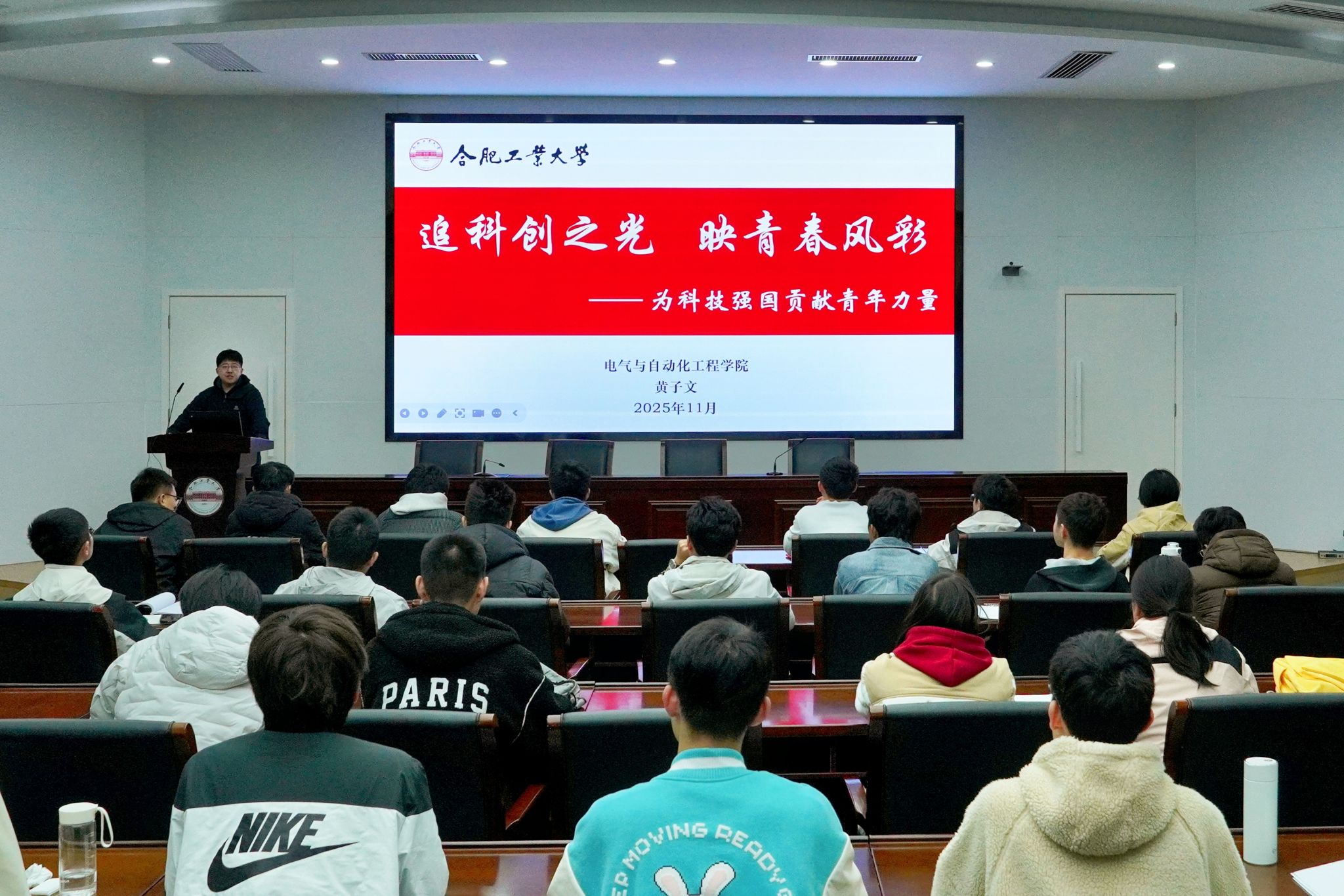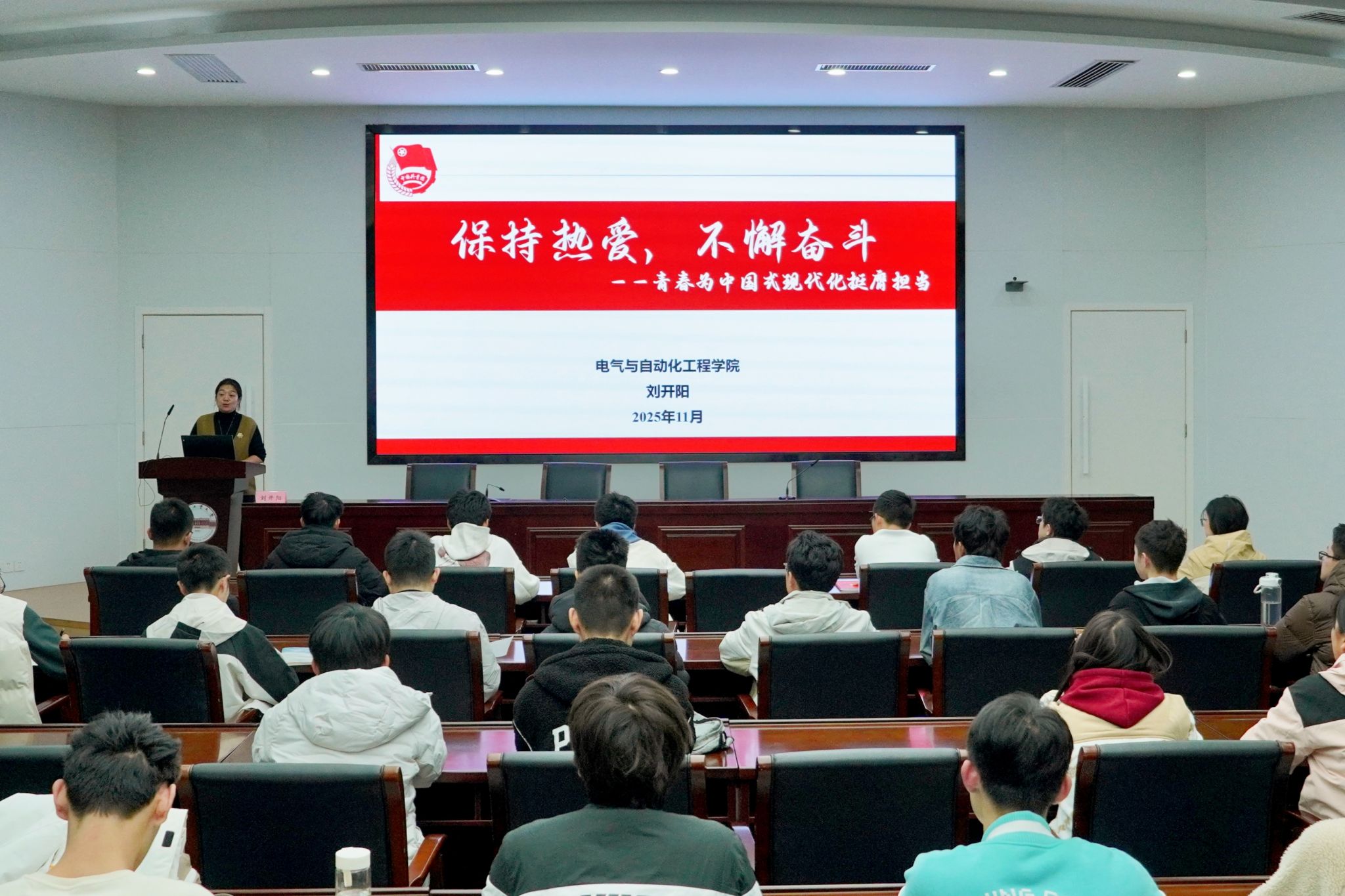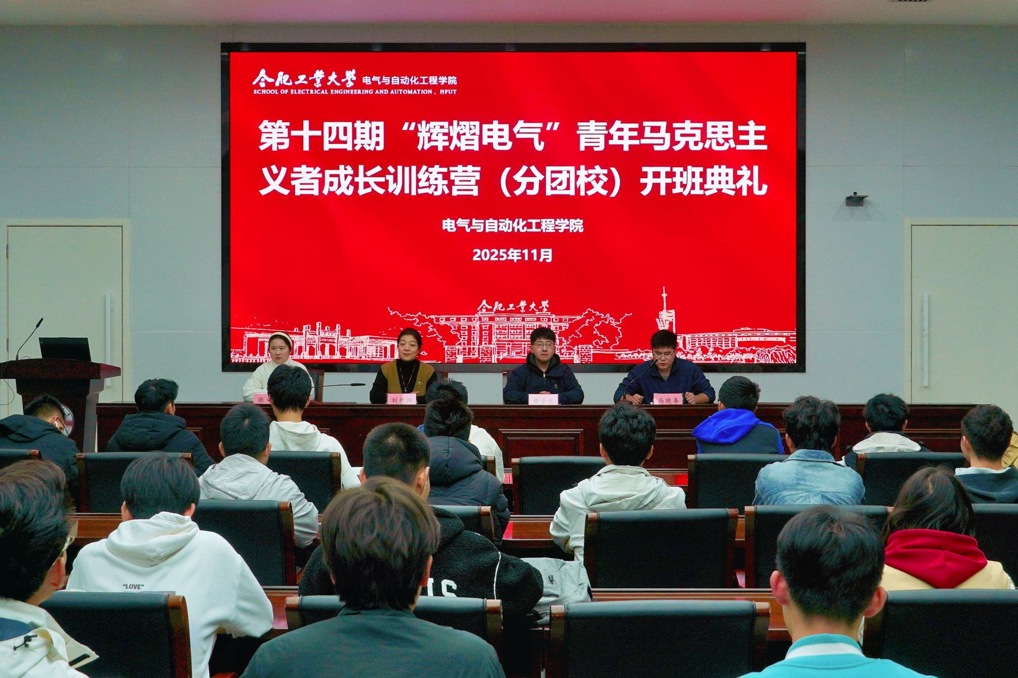 11月21日晚,电气与电气与自动化工程学院第十四期“辉熠电气”青年马克思主义者成长训练营(分团校)开班仪式在屯溪路校区学术会议中心三楼报告厅举行,学院团委、学工办相关教师、团校班主任与参训学员参加仪式。