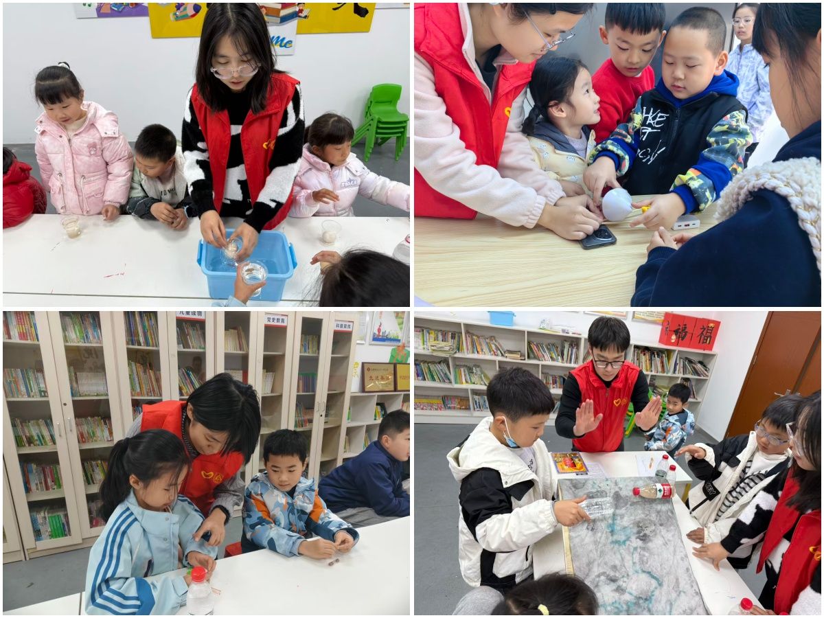 趣味解码科学,实操培育思维。在方桥社区,“不再燃烧的蜡烛”孩子们见证火苗熄灭、水位上升的奇妙现象,志愿者以“捏扁矿泉水瓶”的通俗类比,生动解读氧气消耗与气压变化原理;“声震小风车”让孩子们通过发声驱动风车旋转,直观理解能量转换奥秘;“彩虹瓶子”借助盐水密度差异打造彩色漩涡,让抽象概念鲜活可触。“小小潜水员”“鸡蛋浮沉的奥秘”“瓶子赛跑”等实验,分别从浮力、密度、摩擦力等角度,引导孩子们在亲手操作中观察现象、探寻成因,逐步培养科学思维。