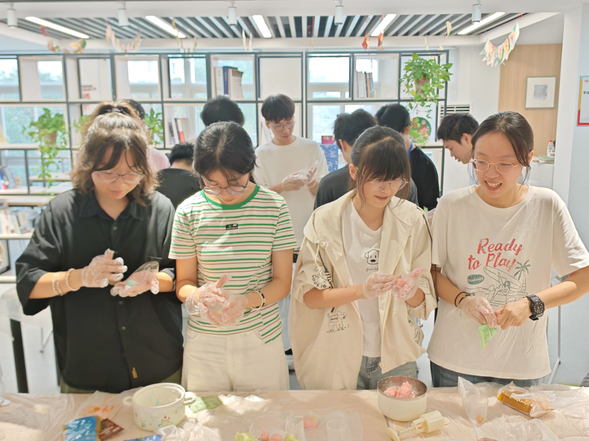 主讲人为同学们讲解中秋节的历史渊源与文化内涵,分享各地中秋佳节的风俗特色,通过视频和手工示范的方式,演示了冰皮月饼的制作方法。随后,大家尝试制作月饼,揉搓面团、包馅,使用模具压出了一个个五颜六色的梦幻冰皮月饼,通过劳动实践感受了传统节日的独特魅力。